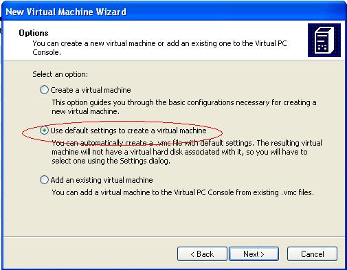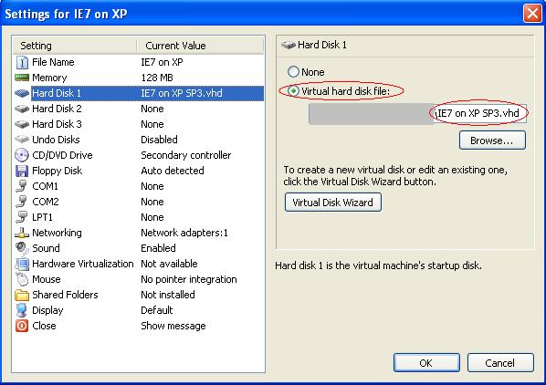 Click on the “New…” button of the Virtual PC Console. Use the default settings to create a new machine. You could choose to create a new one, if you want more control over the settings, but that doesn’t matter much to me. Choose any name for your machine. You want to go into settings after the machine is created, so it’s easiest to leave the settings checkbox checked. When that dialog box opens, choose hard disk 1 and assign to it the vhd file that you downloaded. Press OK.