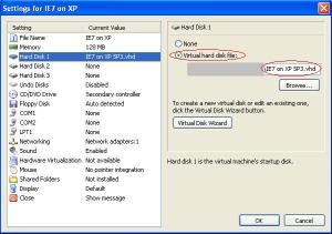 When this .exe file is done downloading it, execute it. It will generate a vhd file, “IE7 on XP SP3.vhd”. This is a “virtual hard drive”.