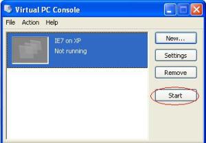 Since I am still running XP, I need Virtual PC 2007: http://www.microsoft.com/windows/virtual-pc/support/virtual-pc-2007.aspx. There is also a version for Windows 7. (Of course if you were on Windows 7, you wouldn’t be stuck on IE6). After you go through the straightforward install steps and run the application you’ll see this window: