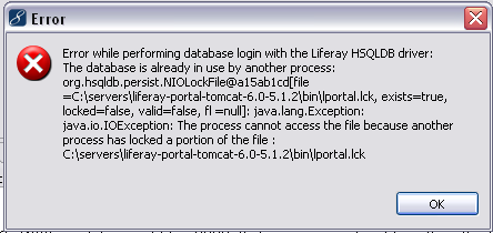 - BUT… if you see the message below (“Error while performing database login with the Liferay HSQLDB driver: The database is already in use by another process:”), it’s probably because Liferay has locked the file. In that case, you’ll need to stop Liferay to open the database.