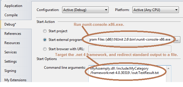 This is for my own future reference. I had nunit tests that I was able to debug without any problem in Visual Studio 2008, with a dll that was targeting .Net 2, but I needed a feature in .Net 4 for a POC. I converted the Visual Studio project to VS 2010, and changed the dll and unit test dll to compile for .Net 4. The tests still ran fine, but I could no longer break in the debugger (from F5). In order to do this, I needed to target .Net 4 framework with the nunit /framework switch (see image), and…